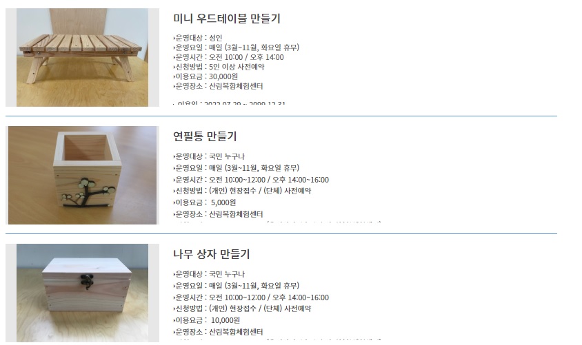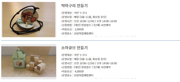 또 캠핑을 즐기고 나셔서 목재문화 체험교실과 숲속체험 프로그램이 있다고 하니 시간 되시는분들은 함께 체험하시는것도 좋을것 같아요.