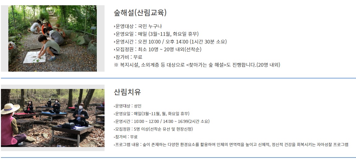 6월기준 운영되고있는 숲속체험은 요렇게 두가지 인데요 참가비가 무료입니다.